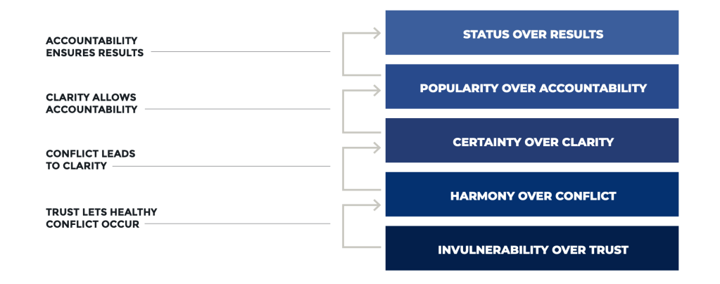 - Choosing Invulnerability Over Trust: CEOs must trust their employees, even when it feels like they are putting their careers in the hands of others. But before a CEO can trust others, she has to be vulnerable. People who trust one another aren’t worried about holding back their opinions or their passions. They will return that trust with respect and honesty, and with a desire to be vulnerable among their peers. To identify it, the CEOs need to ask themselves – do you try to keep your greatest weaknesses secret from your direct reports? Patrick’s advice to CEOs to overcome this temptation is – actively encourage your staff to challenge your ideas.
