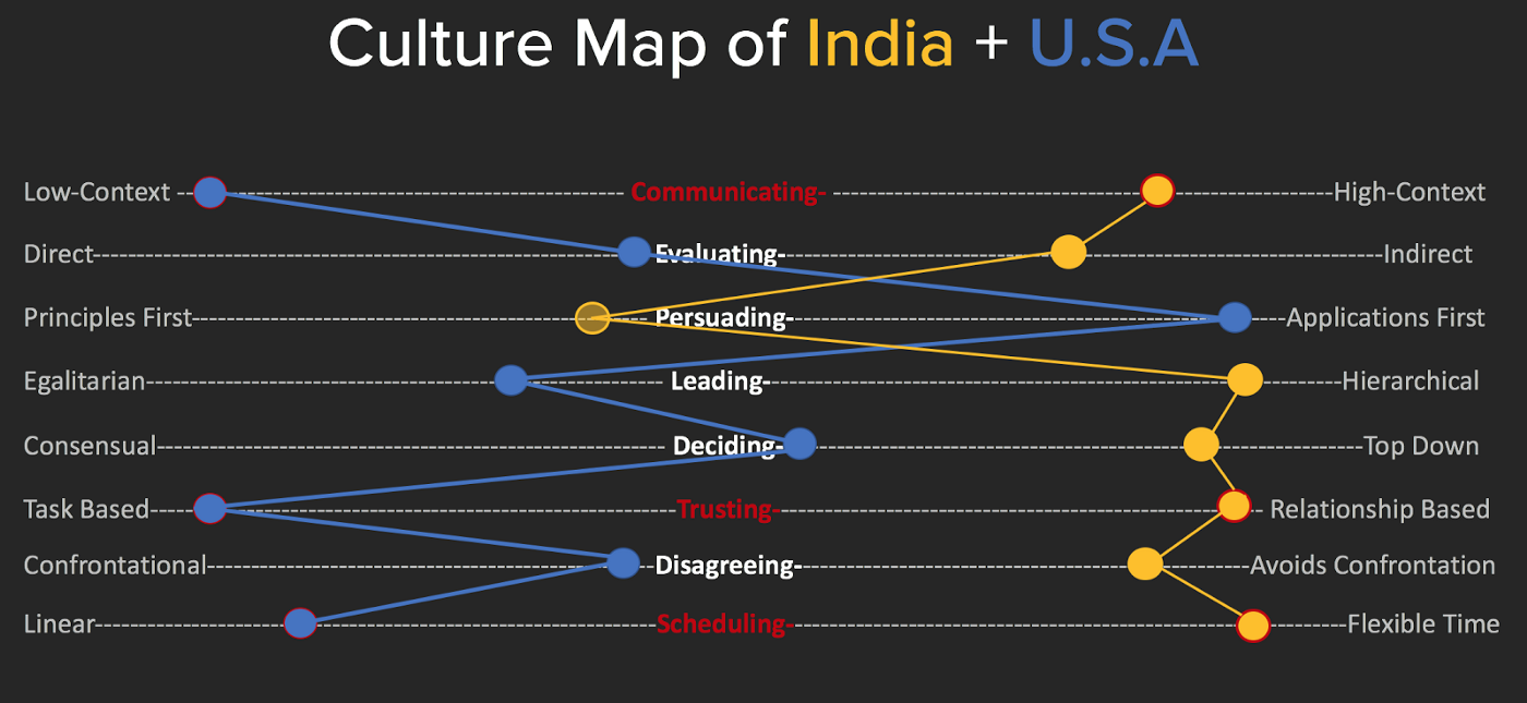 Erin Meyer prepared a framework proposing 8 different scales to evaluate people from different cultural background. Her framework can be used to compare any 2 different cultures, but also to map several different cultures against each other.