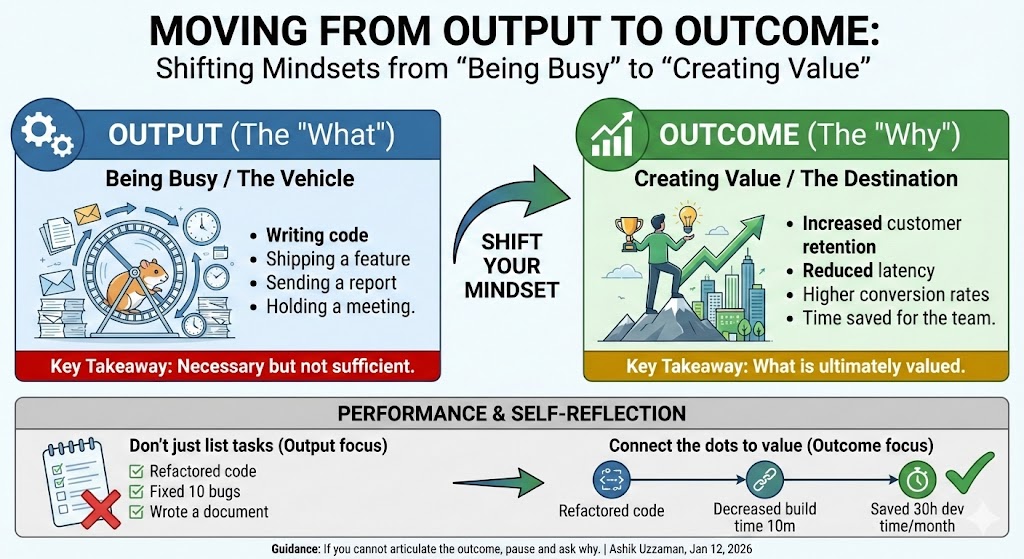 We have all had those weeks. You attend every meeting, clear your Jira board, and ship code every single day. You are exhausted by Friday, yet you have a nagging feeling: Did I actually move the needle? I recently shared a document with my team regarding a critical mindset shift that separates “being busy” from “creating value.” It comes down to the distinction between Output and Outcome. While we often measure our days by what we produce, the business measures our success by the change we create.